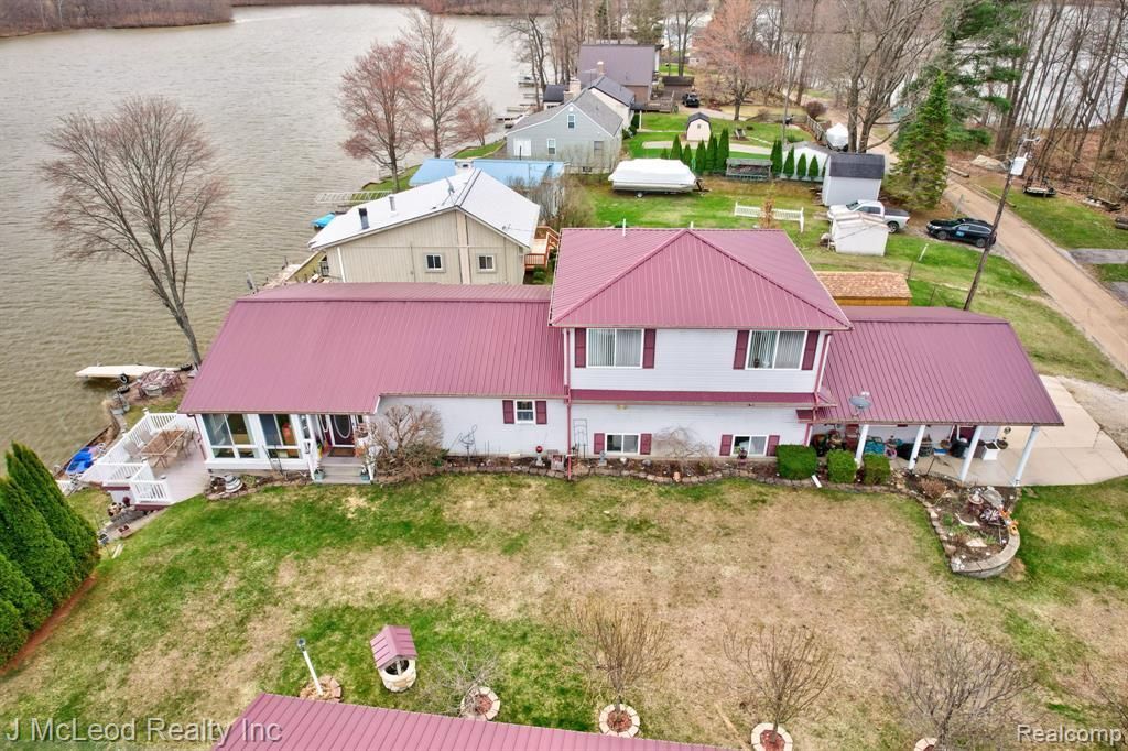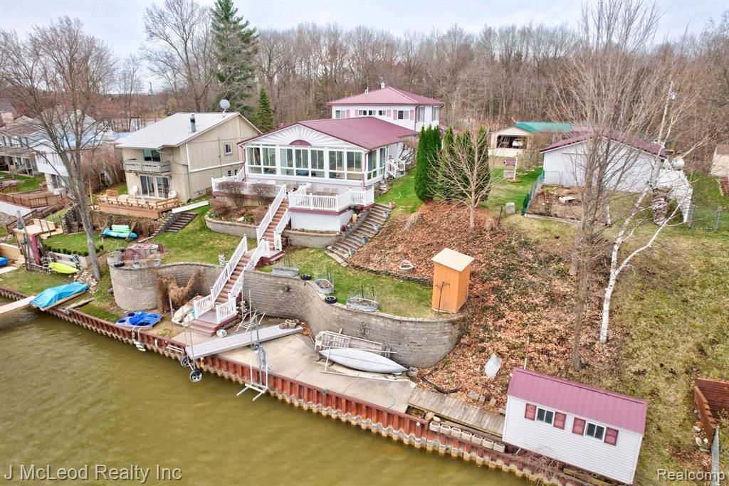 Welcome to lake life at its finest on beautiful Murphy Lake! This spacious waterfront home boasts over 100 feet of frontage on one of the most pristine and sought-after stretches of the lake, offering stunning panoramic views of the widest part of the water. Situated on three lots totaling .33 acres (110x132), this property provides exceptional space and functionality. The exterior is designed for ultimate lakefront enjoyment with a professionally tiered yard, cement paver steps, and an impressive retaining wall leading to Trex decking and steps down to the water. The final tier features paved access to the shoreline, where an aluminum dock is included. Multiple outbuildings offer abundant storage, including a 30x23 pole barn, 2.5 car garage, and three additional sheds—one lakeside shed equipped with electricity and a beverage refrigerator, perfect for entertaining. Inside, you’ll find an open-concept kitchen, dining, and living area ideal for gatherings, along with a main floor bedroom and full bath. A stunning 12x34 three-season room with expansive lake views features a hot tub for year-round relaxation. Upstairs offers a large landing/family room, two additional bedrooms, and a full bath. Adding even more versatility, a portion of the garage has been converted into a private in-law suite complete with a studio-style living space, kitchen, full bath, and laundry—perfect for guests or extended family. Additional highlights include all appliances included, newer windows throughout, and a durable metal roof. Two paved driveways provide convenient access to both the garage and pole barn. Murphy Lake is known for its size, beauty, and recreational opportunities, making it a premier destination for boating, fishing, and relaxing lake days. Located in the charming and quaint town of Millington, you’ll enjoy a peaceful rural setting with small-town charm, while still being just 1–2 hours from Detroit—giving you that sought-after “up north” feel without the long drive.