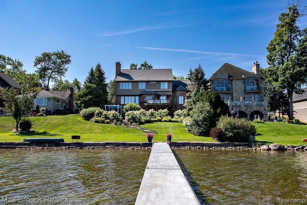 100 Feet of gorgeous lakefront on all-sports Middle Straits Lake, over 5200 square feet of living space, 5 bedrooms, 4 full and 1 half baths, a beautiful newly remodeled kitchen, an incredible primary suite, a fully finished basement with a kitchenette, additional bedroom, and a 3 car garage. Built in 2001, this open floor plan with soaring ceilings has fabulous views to the lake and huge lot from the entire back of the house. The kitchen has white cabinetry, stone countertops, a gas cooktop, double ovens, a SubZero refrigerator and a serving bar with additional cabinetry and a wine cooler. The kitchen dining area walks out to the multi-tiered Trex decking with glass panel railings. The adjacent family room has huge windows overlooking the sparkling water, and a gas fireplace for those cool evenings. The spacious main floor of this beautiful custom home also has large formal living and dining rooms, a first floor office, a powder room, and a laundry/mudroom that leads to the large garage with plenty of room for cars and water toys. Upstairs there are 4 bedrooms, and 3 full baths, that includes one en suite and a huge primary suite with stunning views to the lake, a grand size bathroom with separate vanities, a soaking tub, walk-in shower, private commode room, and 2 huge custom outfitted walk-in closets. The walk-out basement is expansive with 10 foot ceilings, great views to the lake, and has an eat-in kitchen with granite countertops, fridge and a microwave. There is room for a movie theater, table tennis, a family room, a 5th bedroom, a full bath and additional storage rooms. The exterior decking, yard and lakefront are made for relaxing and entertaining a crowd with gorgeous lush landscaping, a boat dock with a tanning deck, and plenty of room to dock your water toys. If you have dreamed of living on the lake, this turn-key home with a rare 100 feet of frontage is ready for you to move right in and start enjoying summer!